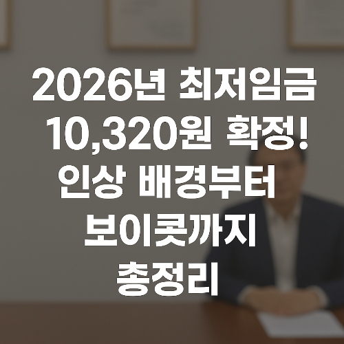2026년도 최저임금이 시간당 10,320원으로 결정됐습니다. 이는 2025년(10,030원)보다 2.9% 인상된 금액으로, 월 환산액(209시간 기준)은 약 2,156,880원입니다. 이번 결정은 2008년 이후 17년 만에 노사공(노동자·사용자·공익위원) 합의로 이뤄져 더욱 주목을 받고 있지만, 그 과정에서 민주노총의 보이콧 사태가 발생해 논란이 되기도 했습니다.