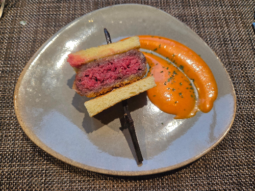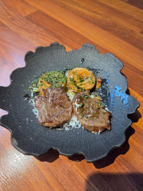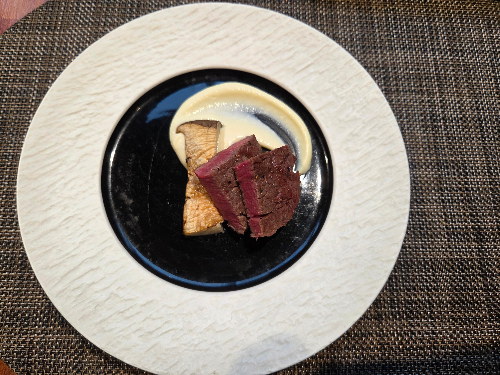 채끝살, 새우살과 트러플, 컬리플라워와 감자로 만든 퓨레
