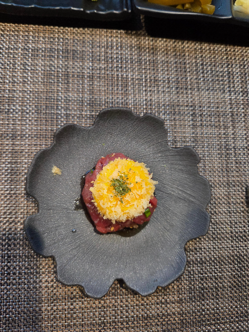 숙성시킨 홍두깨살로 만든 육회와 노란자 반숙 튀김