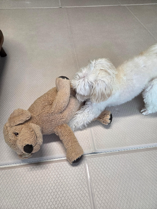 - 우리 강아지 반응: 인형을 물고 흔들고, 껴안고, 레슬링하는 걸 정말 좋아해요.
