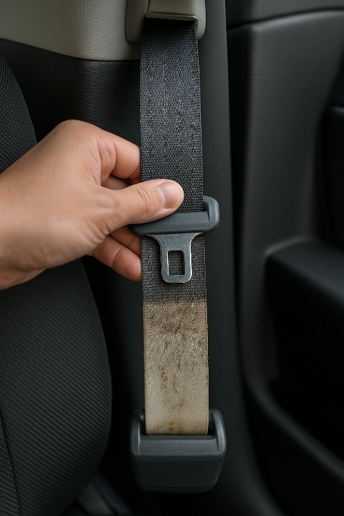 벨트를 끝까지 당겨 안쪽 천을 확인해보세요.침수차는 바닥까지 물이 차기 때문에 벨트 끝부분에 물때, 진흙, 곰팡이 자국이 남는 경우가 많습니다.