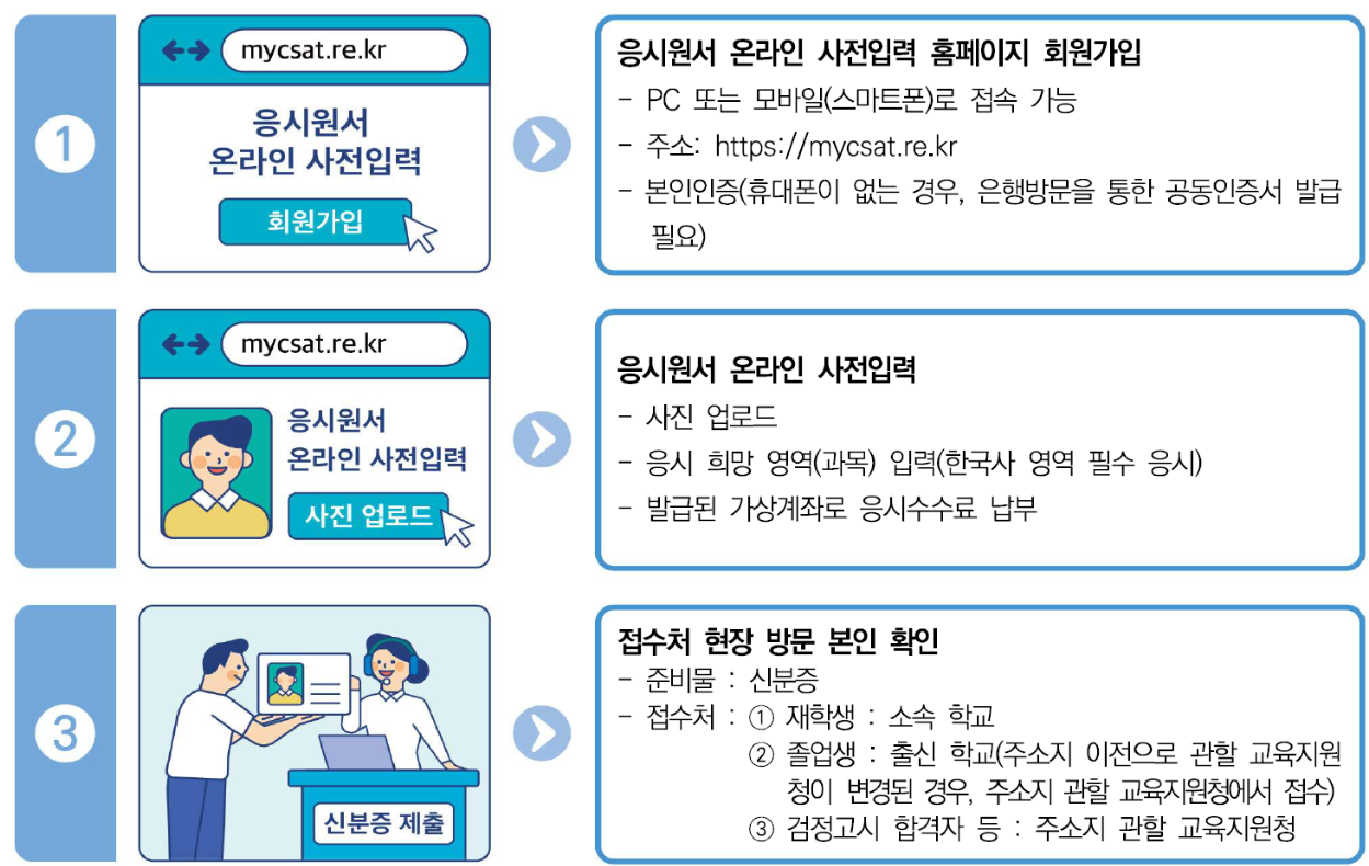 - 올해부터 온라인 사전입력 시스템(mycsat.re.kr) 도입 → 현장 접수 혼잡 완화 목적