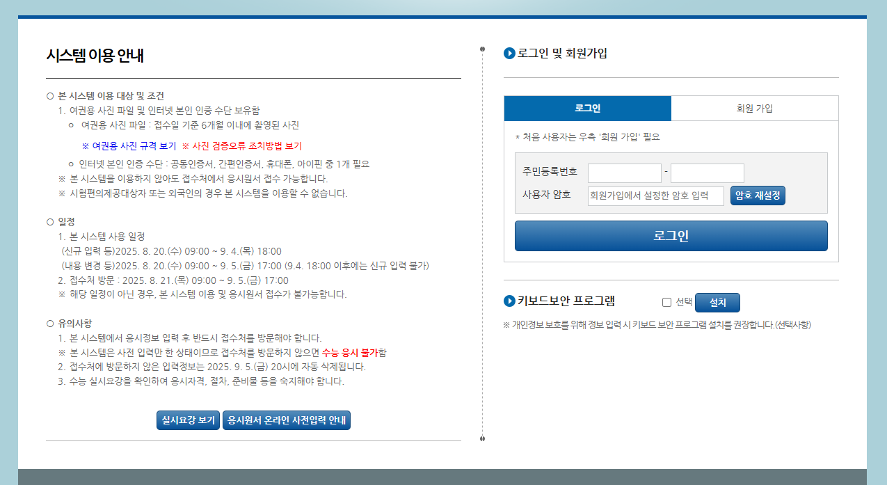 - 온라인 사전 입력2025년 8월 20일(수) 09:00 ~ 9월 4일(목) 18:00(주말 포함, 24시간 가능)