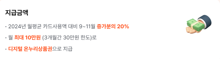 2024년 카드 월평균 소비액보다 2025년 9~11월에 더 많이 쓴 금액의 20%를 디지털 온누리상품권으로 환급해 주는 제도입니다.예를 들어, 작년 월평균 카드 사용액이 100만원인데 2025년 10월에 130만원을 썼다면, 증가분 30만원의 20%인 6만원을 온누리상품권으로 돌려받게 됩니다.
