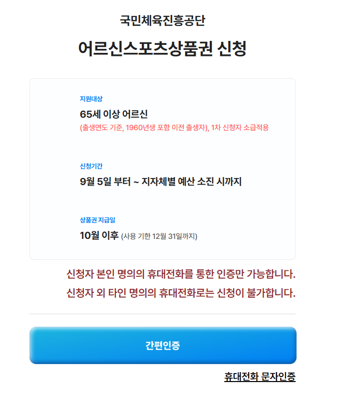 정리하면,이번 어르신 스포츠상품권 2차는 기초연금 수급자가 아니어도,1960년생 이전 출생자라면 누구나 가능합니다.특히 문자인증으로 쉽게 신청 가능하니,스마트폰만 있으면 바로 신청하세요 😊