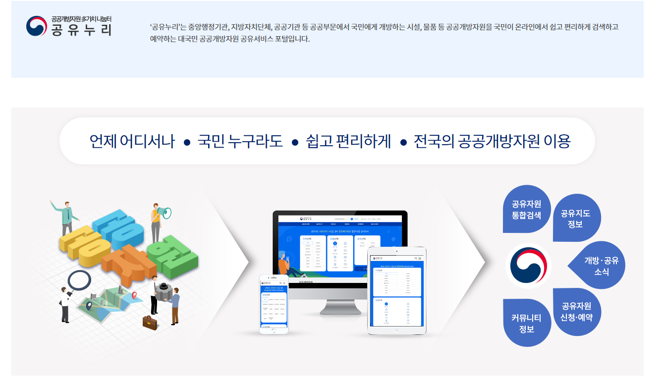 공유누리는 정부와 공공기관이 보유한 공공자원(회의실, 체육시설, 주차장 등)을 국민 누구나 쉽게 검색하고 예약할 수 있도록 만든 통합 플랫폼입니다.국민의 세금으로 조성된 자원을 국민에게 다시 돌려주기 위한 정부의 공공 개방 정책의 일환으로, 공공자원의 효율적 활용을 목표로 하고 있습니다.