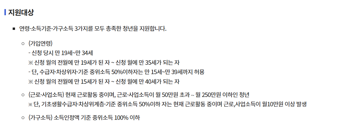 - 대상: 만 19~34세의 근로 청년 중 중위소득 100% 이하
